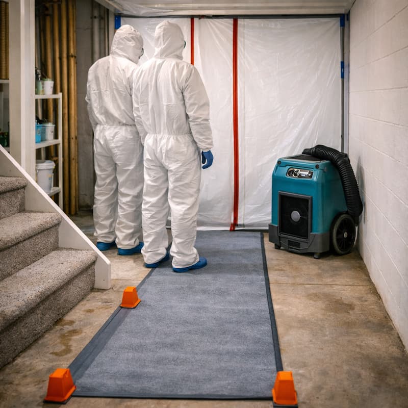 Basements connect directly to the rest of the home through stairwells and HVAC pathways. We set up controlled work zones and clean pathways to reduce the chance of tracking contaminants upstairs and to limit odors and airborne particles during cleanup.